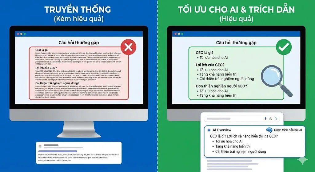 – Ví dụ thực tế: phần FAQ rõ ràng với câu hỏi ngắn và trả lời súc tích sẽ tăng khả năng được chọn làm trích dẫn.