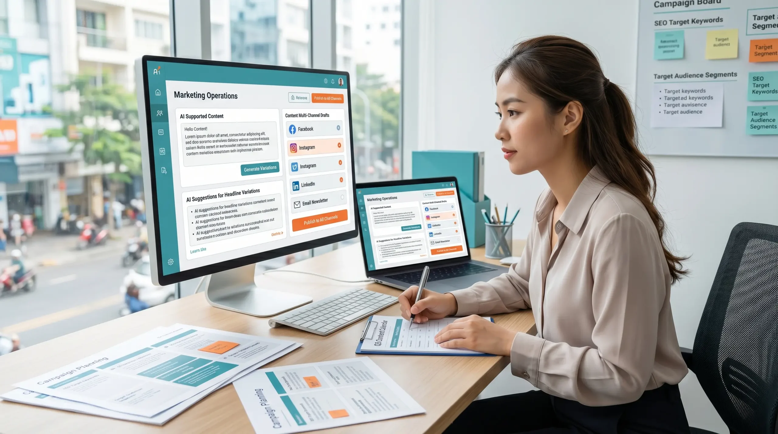 Nhân sự marketing sử dụng AI để tạo content nhanh hơn và triển khai nội dung trên nhiều kênh