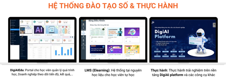 4. Nền tảng đào tạo & thực hành: Hệ thống DigiAIEdu & LMS thông minh tích hợp AI quản lý đào tạo, chứng nhận số, theo dõi tiến độ học tập và thư viện tài liệu điện tử, mang đến trải nghiệm học tập linh hoạt, hiệu quả và cá nhân hóa. Hệ thống thực hành DigiAI Platform và các Công cụ khác.
